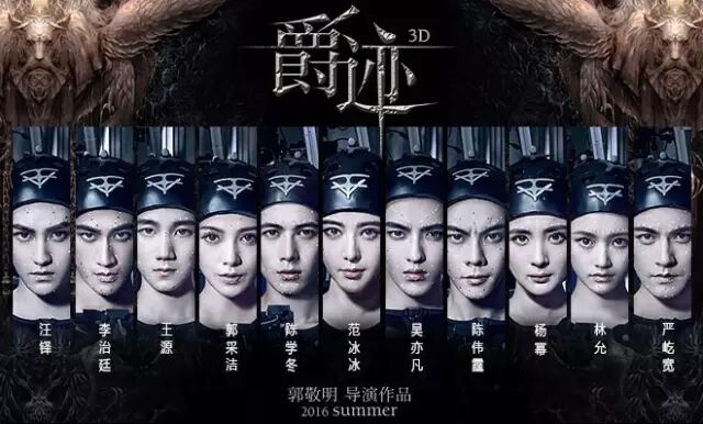 吓到了有没有!这个组号称十二大主演——范冰冰、吴亦凡、陈学冬、陈伟霆、郭采洁、杨幂、王源、李治廷、林允、汪铎、严屹宽还有外挂郭敬明!连微博九宫格的放不下!实力明星阵容!这个神奇的剧组就就是号称要上天的《爵迹》剧组。