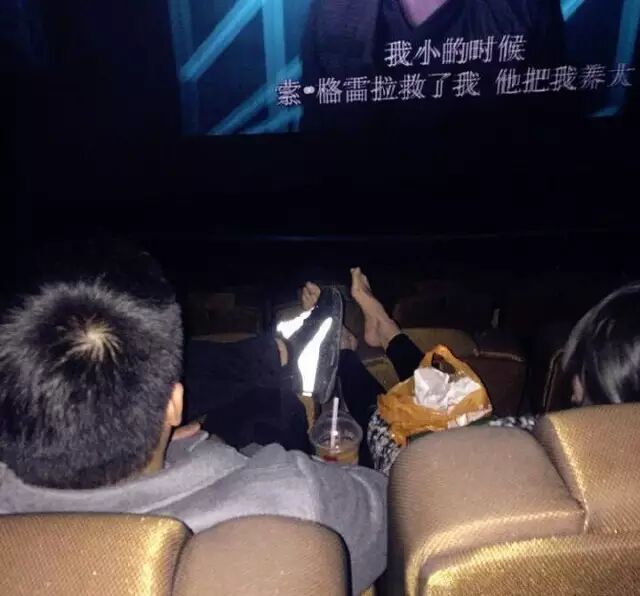 结果遇到了这么两个人,真是醉醉的。因为午夜场人不多,大家就都集中坐在中间的位置,结果前面这两个人直接把脚挂在前面椅子上,前面本来有人坐的,那女的脚直接放在人家头顶,前面的女生当然不乐意了,就吵起来了。