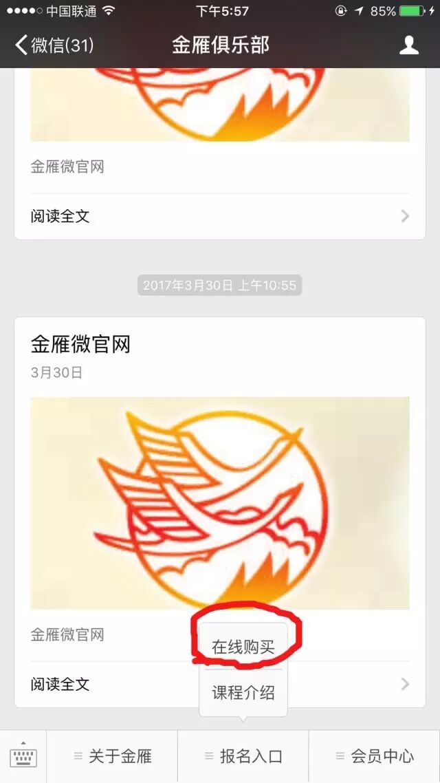 手机端:微信关注“金雁俱乐部”公众号,点击【报名入口】》【在线购买】