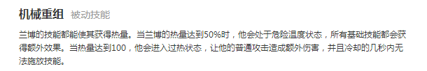 解析:兰博的被动是一个非常独特的机制,他在危险温度状态的时候会对他的所有技能都提供一个额外效果,所以一个玩得好的兰博,绝对是会控温的,而兰博过热之后的伤害虽然非常高,但是自己却无法施放技能,所以这个过热的时间一定要把握好。