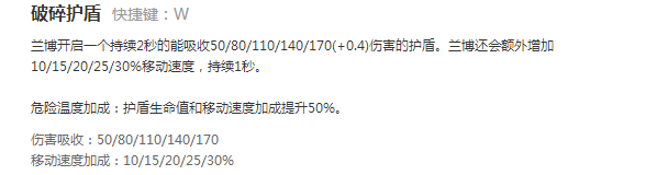 解析:兰博是一个无位移的英雄,逃生能力非常差,而W技能刚好弥补了这一点,W技能所提供的护盾和加速效果让得兰博进可攻退可守。