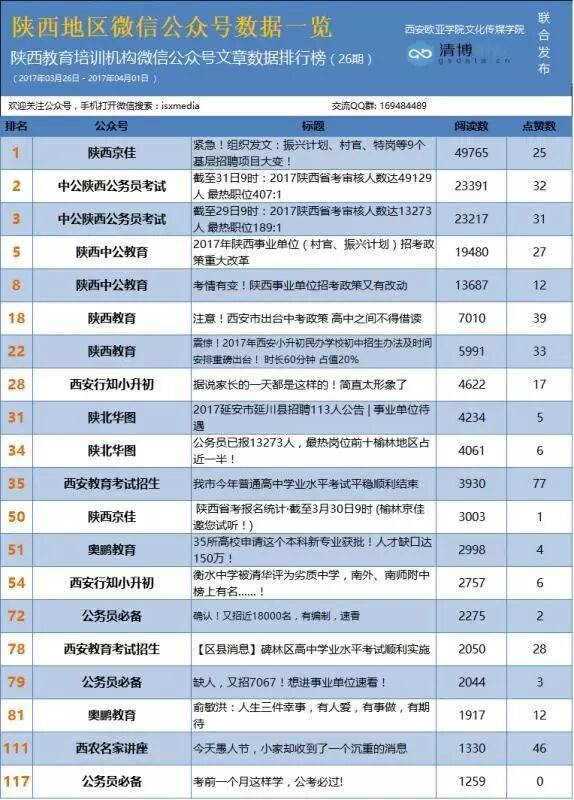 “陕西京佳”发表的《紧急!组织发文:振兴计划、村官、特岗等九个基层招聘项目大变!》以49765的阅读量居于榜首。排名第二、第三的均出自于“中公陕西公务员考试”,阅读量也是旗鼓相当,徘徊于23000与23400之间。