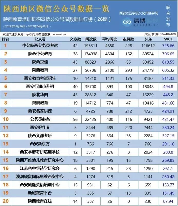 “中公陕西公务员考试”本期依旧位于榜首,但是其阅读量与上期相比有所下降,阅读总量为195311,WCI传播指数725.66,与上期相比差距较大。排名第二的是已经被我们所熟知的“陕西中公教育”,阅读量为174938,WCI传播指数为706.65.“陕西京佳”从上期的第六冲进了本期的第三,共发表文章43篇,阅读量88823,听起来还是很吉利的一组数据,WCI传播指数610.55.“陕西教育”依旧排名第四,“西安教育考试招生”同样持续上期的排名,没有发生变化。