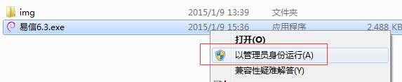 下载好软件之后解压,你会看到一个易信6.3 的exe 文件,如果你是xp系统的话就直接双击打开运行。如果是win7和win8双击打开不能运行的,请右键点击选择以管理员身份运行。如下图所示: