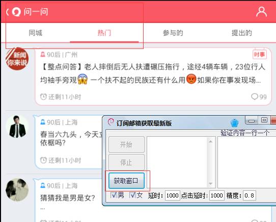 辅助软件运行了之后,你需要拖到刚刚我们已经在运行着易信的安卓模拟器旁边。然后点击辅助软件的“获取窗口”按钮,接着把鼠标移动到易信的“问一问”页面窗口两秒钟,辅助软件就能成功获取到窗口了。获取窗口成功之后,你可以在右边输入一些添加好友时的验证信息,比如“你好,请加我”,或者“你好,加个好友吧”等等。这个跟微信打招呼是类似的,当然你也可以不输入。最后,点击开始,辅助软件就会帮你批量添加易信好友了,你只需挂着电脑就行。如下图所示: