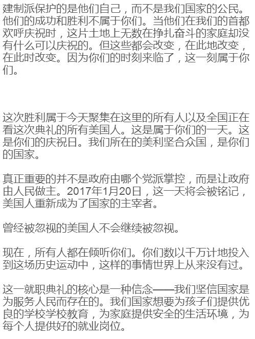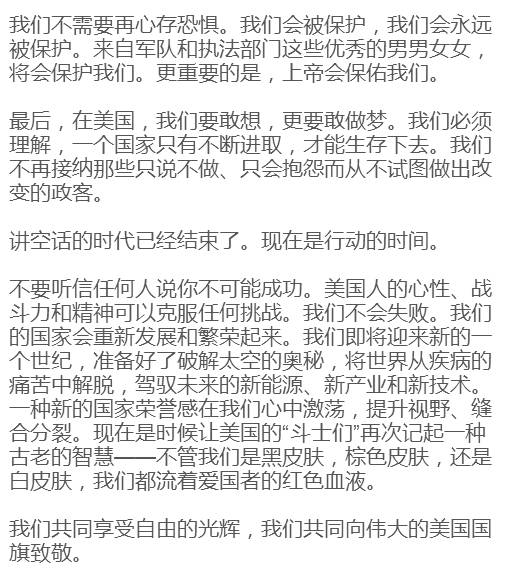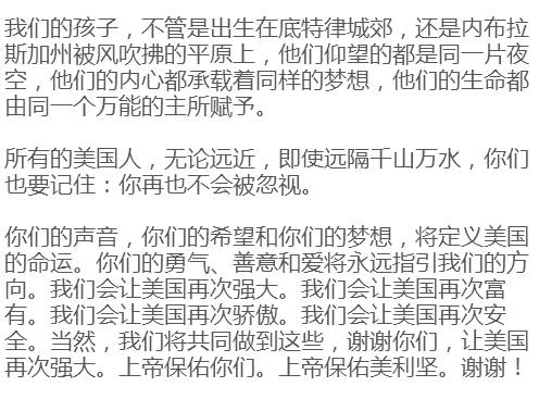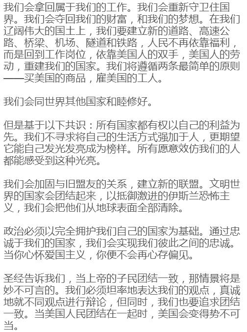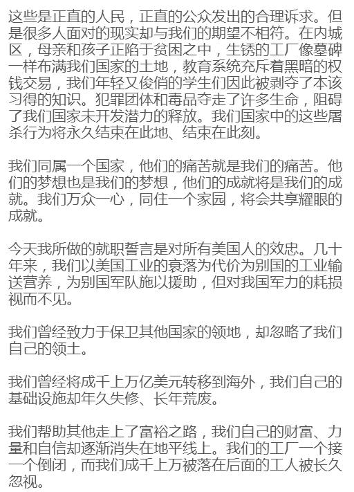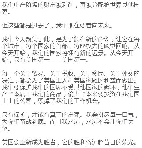 We assembled here today are issuing a new decree to be heard in every city, in every foreign capital and in every hall of power. From this day forward, a new vision will govern our land. From this day forward, it's going to be only America first -- America first.