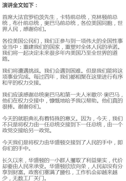 Chief Justice Roberts, President Carter, President Clinton, President Bush, President Obama, fellow Americans and people of the world, thank you.