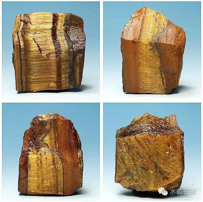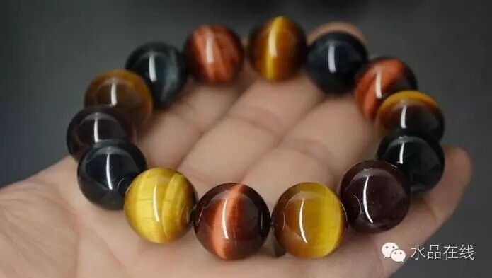 普通的虎眼石一般为黑黄相间的色调,正像是老虎皮毛的纹路,也有蓝黑黄相间的。比起二色相间,三色的更为稀有,而正所谓物以稀为贵,这种三色的价值自然也比二色的高。