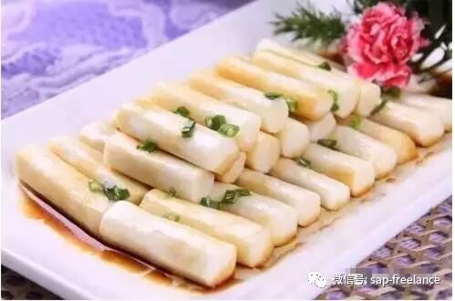 然后将山药去皮洗净,切成条,入沸水锅中焯水,捞出沥干;