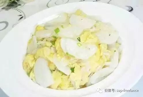 下山药片,炒至软,将山药拨向一边,将鸡蛋倒入另一边,待结成块,再与山药一并炒匀;