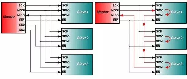 图4:主控制器与独立从设备(左)及菊花链从设备通信(右)
