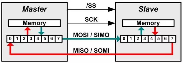 在数据交换之前,主控制器和从设备会将存储器数据加载至它们的内部移位寄存器。收到时钟信号后,主控制器先通过MOSI线路时钟输出其移位寄存器的MSB。同时从设备会读取位于SIMO的主控器第一位元,将其存储在存储器中,然后通过SOMI时钟输出其MSB。主控制器可读取位于MISO的从设备第一位元,并将其存储在存储器中,以便后续处理。整个过程将一直持续到所有位元完成交换,而主控器则可让时钟空闲并通过/SS 禁用从设备。