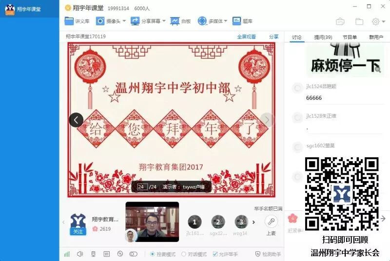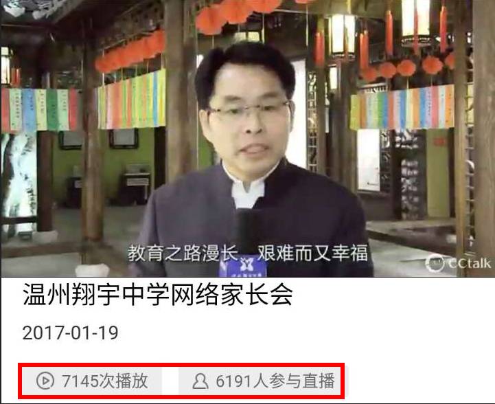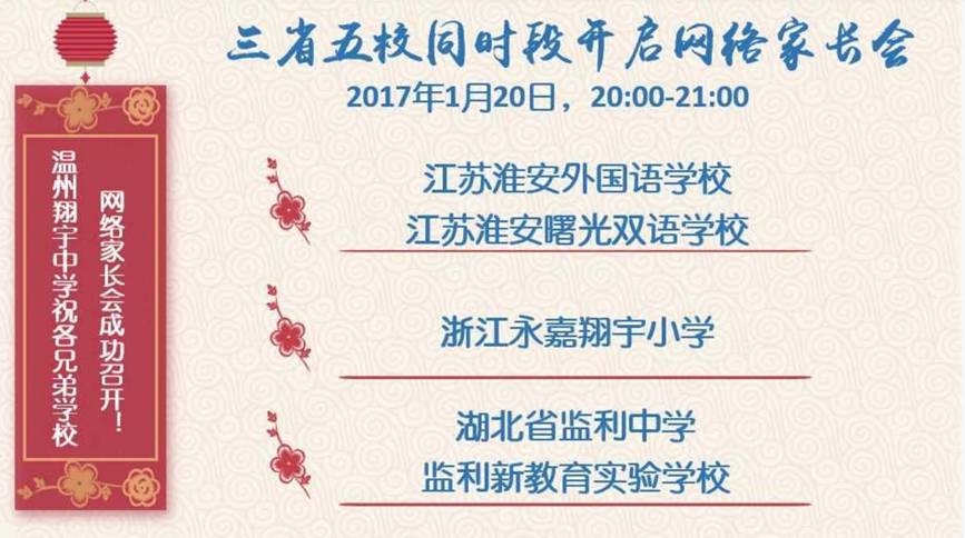 2017年1月19日晚,翔宇教育集团旗下的温州翔宇中学率先召开了网络家长会,翔宇教育集团总校长卢志文、集团副总校长高立顺向师生家长们在外地送上新年贺词与激情演讲,温州翔宇中学初中部副校长麻柏林、高中部副校长严强亲自主持家长会。一个小时的时间里,超过6000位来自翔宇中学及其它翔宇学校的家长、学生、老师线上同步参与,创下K12最大规模网络家长会记录!