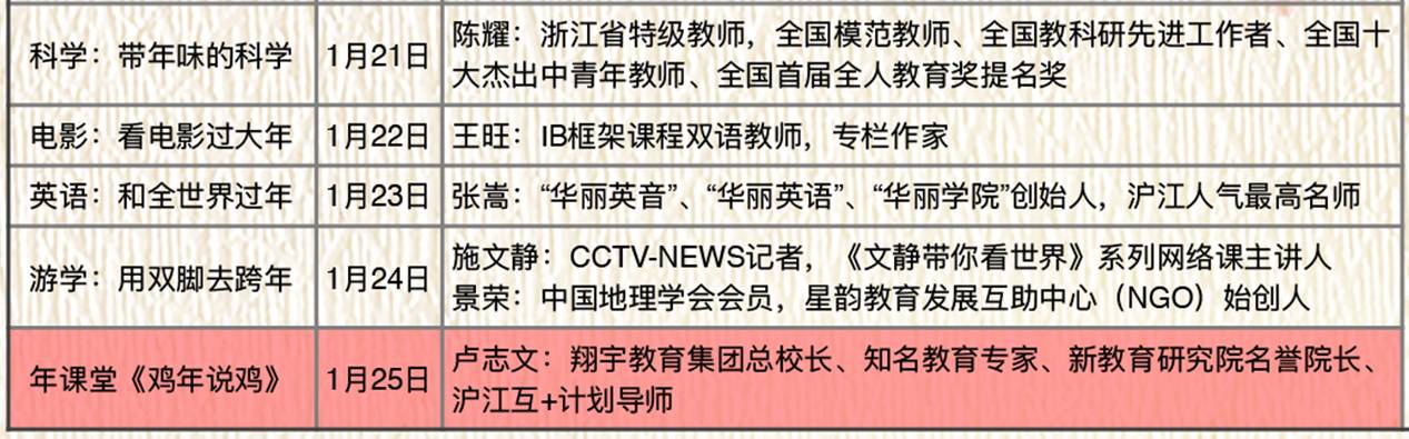 2017年1月21日到25日每晚20:00,翔宇教育和沪江联合找到最有趣的老师以期为学生们带来最有趣的课程,让寒假中天南地北的翔宇学子相聚一堂共赏“年味”——