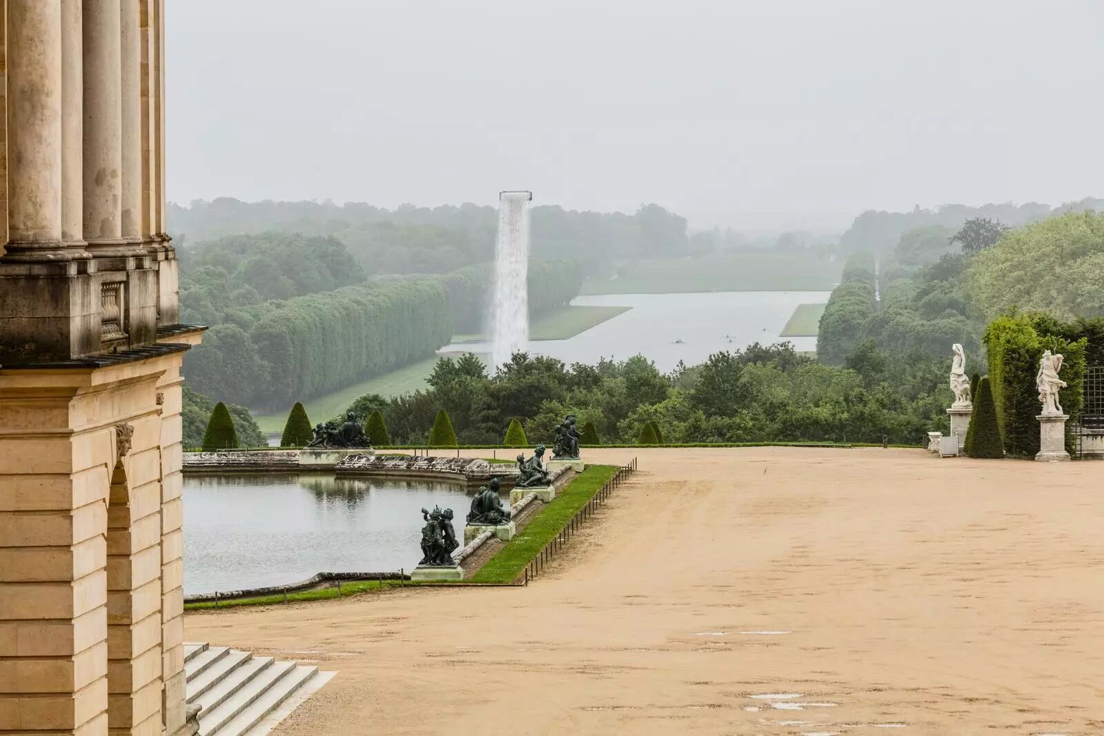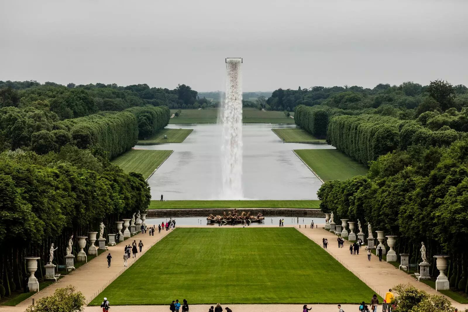 空间与画面的区分在于维度,而对维度的体验来则自运动。位于 Grand Canal 这条中轴线上的瀑布装置,便成了丈量空间的一种方式。来访者通过对瀑布水流速度的观感,判断空间距离的远近。观众能透过凡尔赛宫室内的窗户,安静地远观这极速下流的水柱,穿过花园步行至瀑布之前,零距离感受飞流直下的震慑。