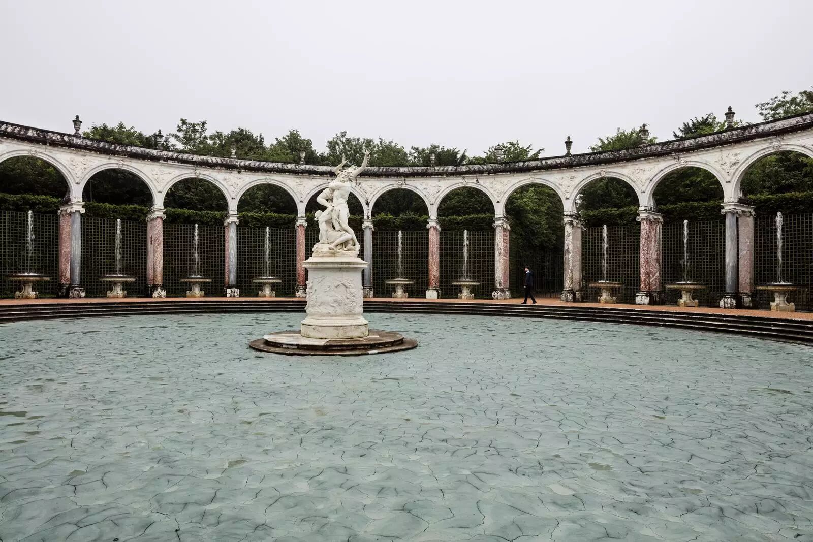 在室外 Bosquet de l’Etoil 的作品《Fog Assembly》,Olafur Eliasson 利用光与风的质量控制烟雾的产生,模糊了装置的边界,制造出空间的瞬时与变化感。另一作品《Glacial Rock Flour Garden》,则以格陵兰冰川石粉末在 Bosquet de la Colonnade 围绕,在象征生殖繁衍的 Pluto abducting Persephone 女神像周围,打造了一座如旱地般枯竭凝固的喷水池。