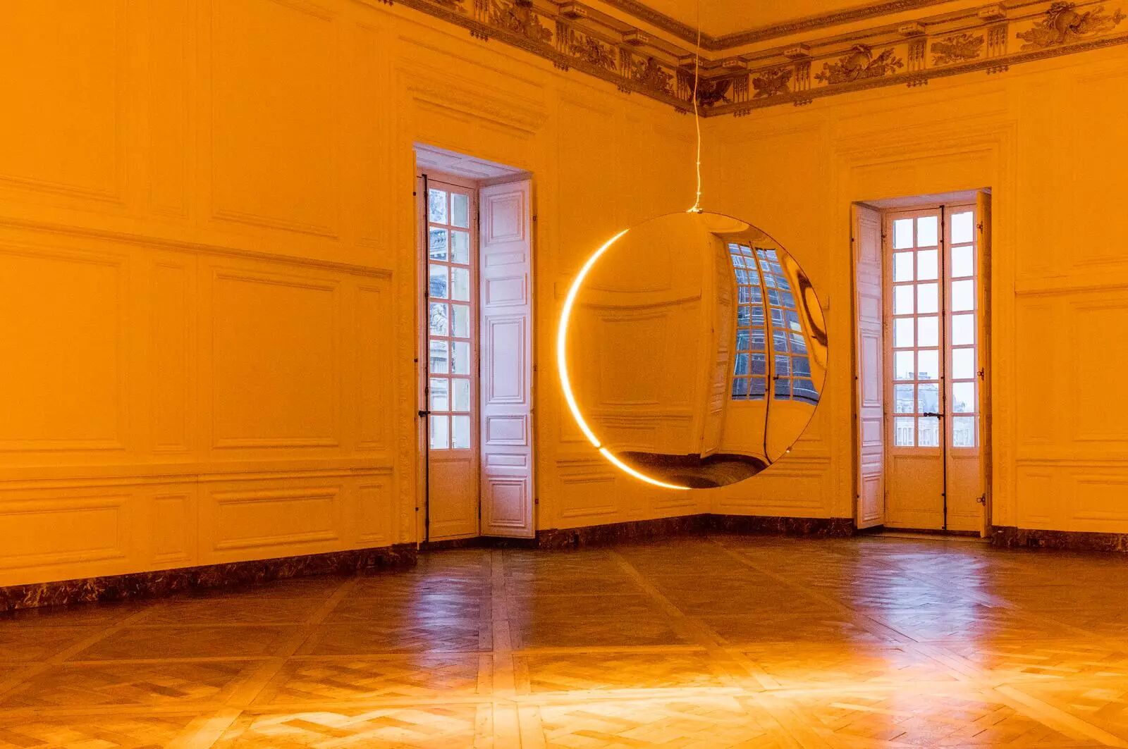 在室内,Olafur Eliasson 用镜面与灯光实现细微的空间置入。镜面被圆形切割、填充上黄色单频光,形成两个不同比例的镜像;加之黄色深镜和黑色深镜对立放置,观者可以透过身体的前后左右移动,在持续与间断之中玩味无限的镜像。而安置在窗户上的凡尔赛之眼,则吸引观者进入一个更迷你的宇宙,看着自己微缩、倒立的镜像。《The Gaze of Versailles》by Olafur Eliasson