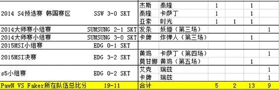 PawN VS Faker赛事对决总比分:13-9,单杀比分:5-2。