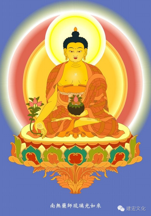 药师琉璃光如来,梵名鞞杀社窭噜,简称药师佛,又作药师如来、药师琉璃光如来、大医王佛、医王善逝、十二愿王。、阿弥陀佛为"横三世"亦称三宝佛,于东方净琉璃光净土,为大医王佛,具法身佛相,身蓝琉璃宝色,右手持药珂子连枝带叶,左手定印托钵,钵中蓄满甘露,着三法衣,双定跏趺安住莲华。药师佛心咒(注音):