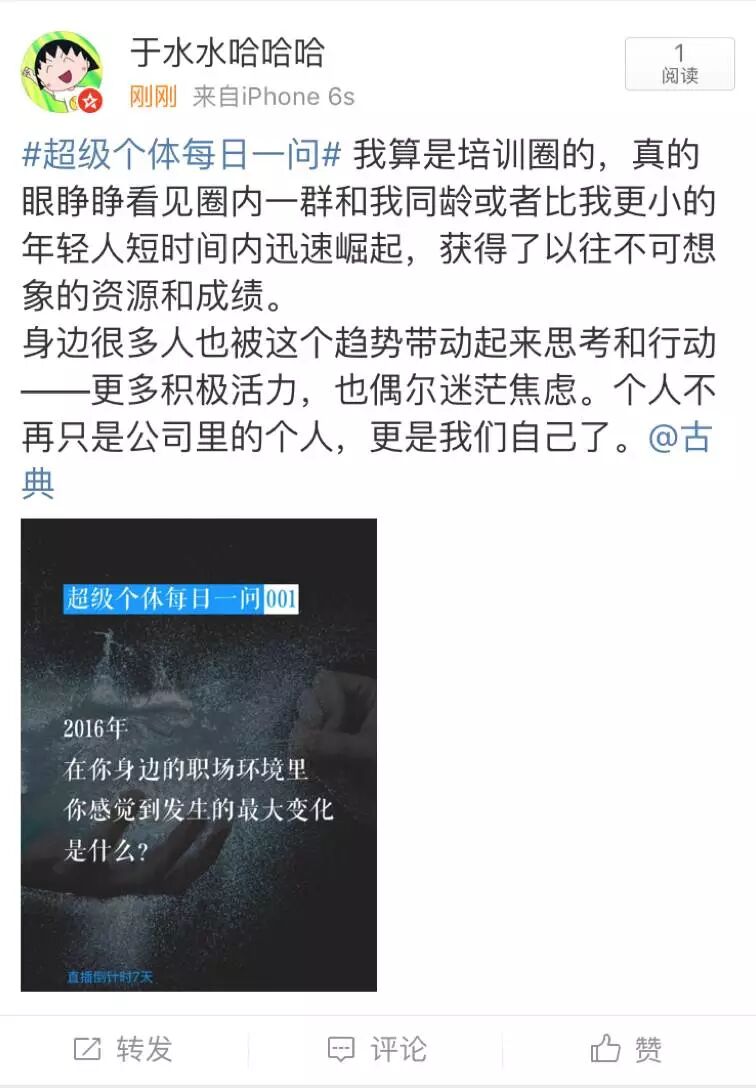 2. 为了鼓励和感谢你们的思考,我会每天在@我的微博里找到我最喜欢的回答,直接送你我在“得到”app的全年订阅专栏《超级个体》(如果恰好选中的是已经订阅了的同学,我给你报销,算我送你啦)。并邀请答主加入专属的直播福利群,一起聊天发红包送礼物!