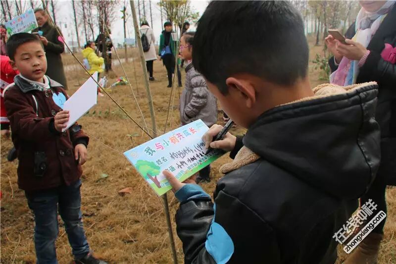 小朋友们把自己的名字写在心愿卡上挂在树苗上