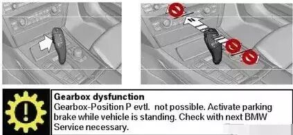 4.一旦起动机被接合,马上按住选档杆上的解锁按钮,把选档杆向前推到N档位置。保持选档杆在N档位置,直到听到检查控制信息的报警音“Gong”,此时检查控制信息会显示"GEARBOS DYSFUNCTION"。至此请释放选档杆。