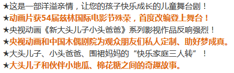 由中国木偶剧团演出的央视动画授权儿童舞台剧《新大头儿子和小头爸爸之机器人》将于7月9日在辽宁中华剧场上演。大头儿子一家“跳”出电视荧幕,走上舞台和小朋友们亲密互动,一定会赢得小朋友们的欢心,舞台效果提前看!