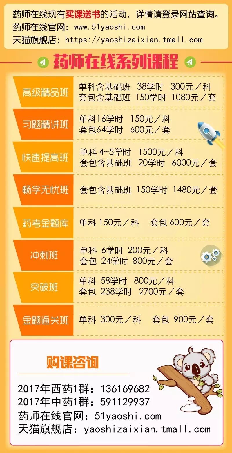 为了让大家掌握最新的复习资料,药师在线将在周一至周六为大家推出《2017国家执业药师考试复习精要》,其中由于法规科目尚未出版,我们暂时不做更新,周日我们为大家准备了《2017国家执业药师考试通关必做2000题》,而2016年高频易错考点及口袋书以后将不再更新!祝大家复习顺利!
