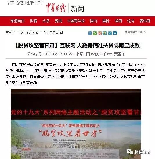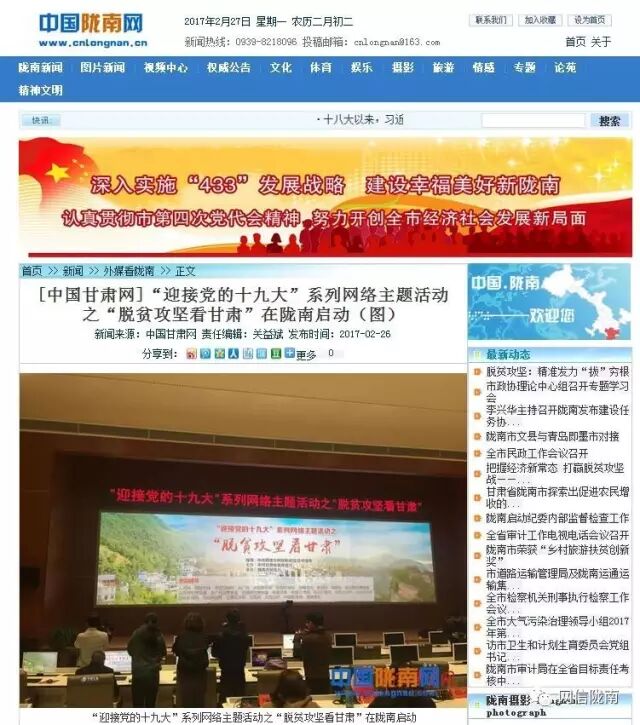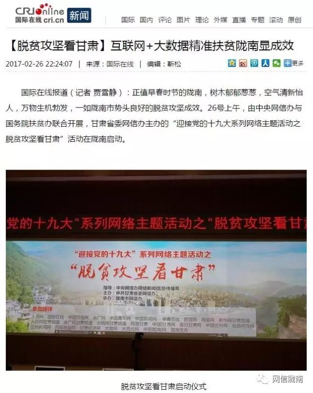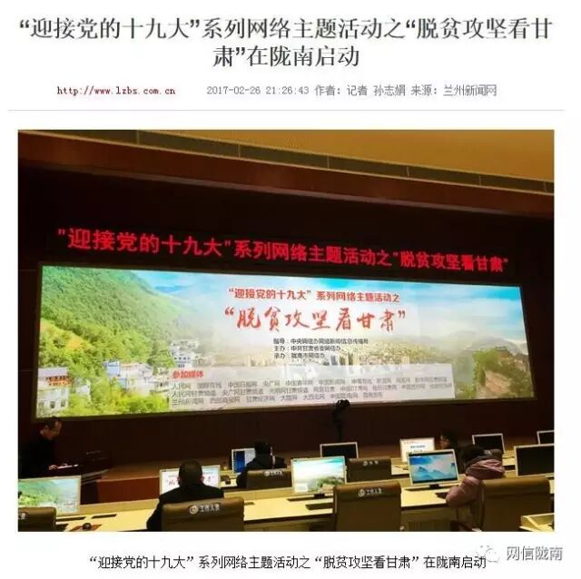 2月26日,,甘肃省委网信办主办的“迎接党的十九大”系列网络主题活动之“脱贫攻坚看甘肃”活动在陇南举行。来自全国及省内25家网络媒体代表汇聚陇南,先后深入陇南市大数据政务中心、武都区、康县进行采访,共同见证脱贫攻坚工程在陇南的生动实践。