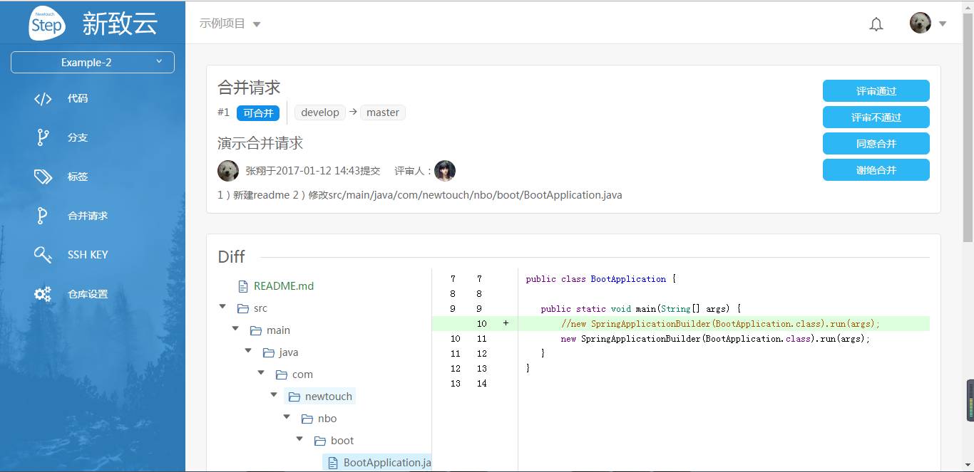 新建合并请求的场合,可以填写代码评审人。我们会用邮件和通知的方式提醒该用户进行代码评审。在合并请求详情中会展示被变更的代码部分,评审中产生的问题,可以在备注中记录。