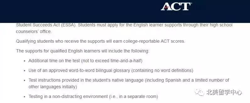 据ACT官方消息,自2017年秋季起,ACT将为符合条件的English Learner(即英语非母语的考生)提供考试时的辅助。ACT解释说此举是希望ACT考试能准确地反映学生真正在学校学到的知识的水平(不因为英语能力而影响到真实水平的发挥)。
