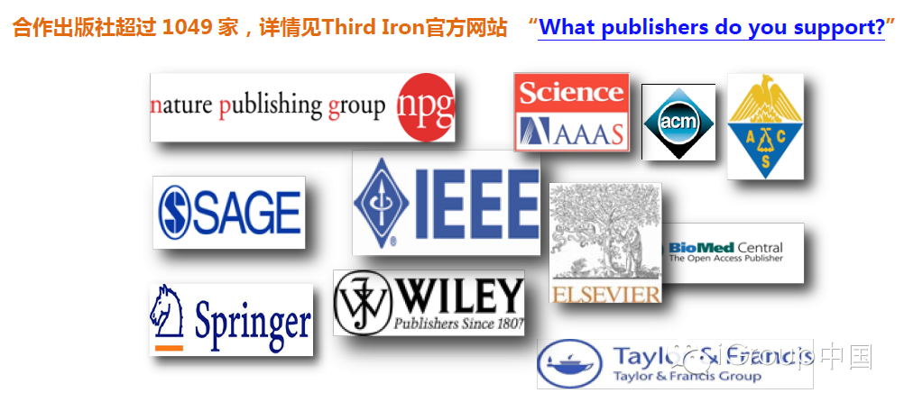 合作出版社包括Elsevier,Springer,Sage,Wiley,IEEE,ACS等超过1049家