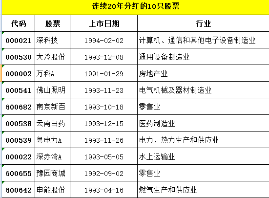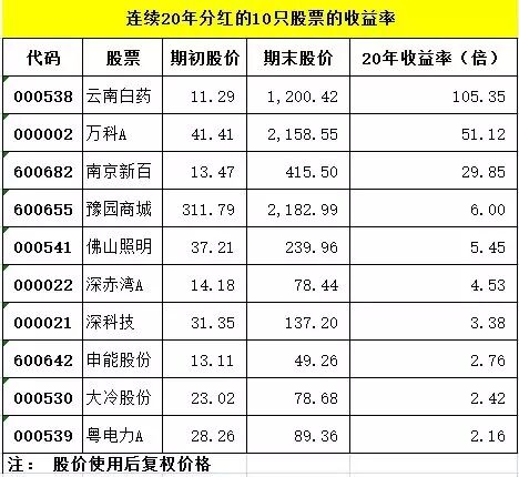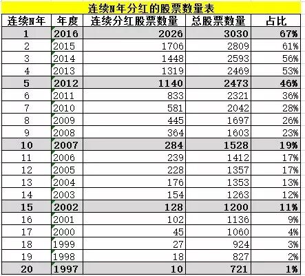 A股的股息率终于统计完成了,发一些统计数据。 A股有10只股票,连续20年分红,1997年底的时候有721只上市公司,能够连续分红的股票占比1.4%,有些大名鼎鼎,像万科、云南白药。独家第一涨停微Xin公zhong号tansuozhe198每天免费niu股参考,加tansuozhe888微Xin有福利 能够连续20年分红的股票的收益率,差异很大。 并不是能够连续分红就有高收益。 20年收益率的中位数是5倍,最高的云南白药达到105倍,最低的粤电力A只有约2倍。 能够长期连续分红,很不容易。 今年分红的股票占比67%,连续5年分红股票占比46%,连续10年占比19%,连续15年占比11%,连续20年占比1%。 12月26日的股息率排行榜前30只股票独家第一涨停微Xin公zhong号tansuozhe198每天免费niu股参考,加tansuozhe888微Xin有福利 分享给大家作参考! |