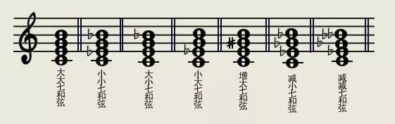 (2)符号 7 表示 b7 音,因此,加上第四个音成为1 b3 5 b7