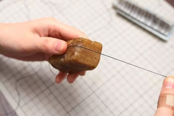 把线搭在蜡块上面来回轻拉两三次,注意不要上太多蜡,然后手指捏着线来回拉几次把蜡搓匀,顺便把线上面多余的蜡粒搓掉,双手可以搓几次,把多余的蜡蹭一点在手指上面,这样手指拿针不会打滑。