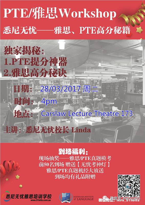 更多细节欢迎大家踊跃报名参加此次的校园讲座,也许你马上就能成为下一个高分大神哦~~!赶紧私信悉尼无忧雅思(mrs_51ielts或扫下面二维码)预约抢位哦!