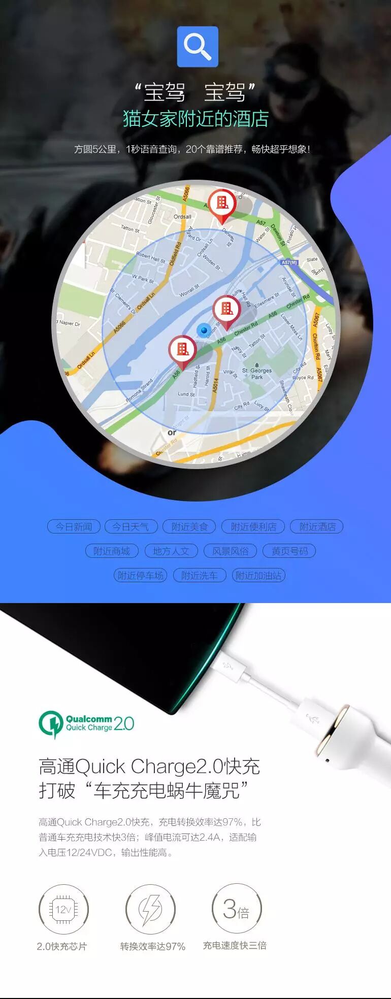 可以帮助司机安全驾车,拥有一句话导航、音乐点歌、免提通话、全语音操控、车联网服务和车载快充等多种功能。这款车载蓝牙采用了在线、离线混合式语音识别,支持 13 个领域的语义理解。