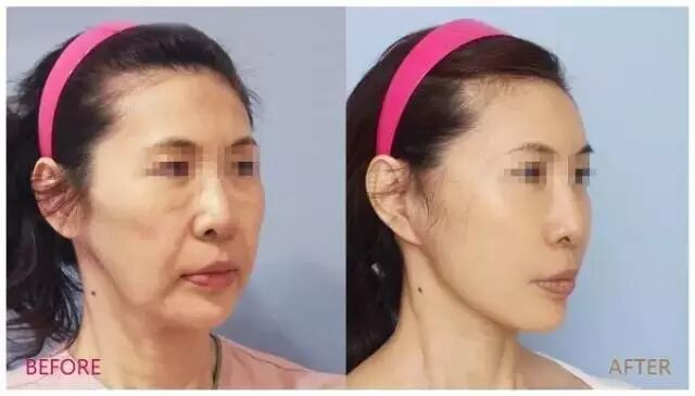 半脸提拉即刻效果对比:左脸线条清晰、苹果肌紧实,法令纹明显改善,小V脸立现、整体呈现年轻漂亮