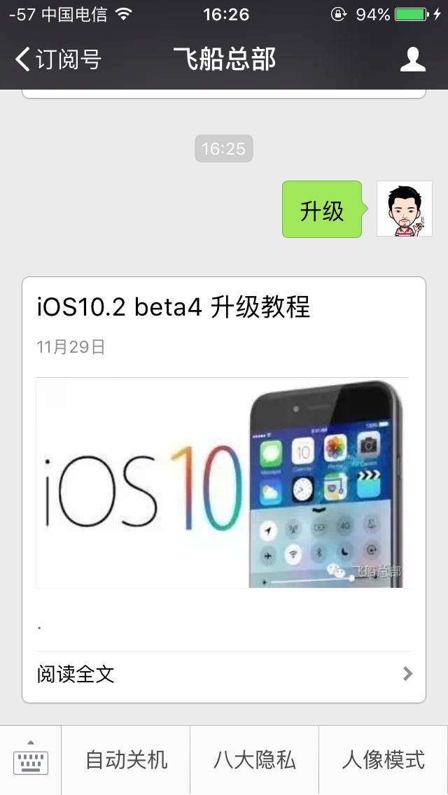 如果你也想体验最新的测试版,可以在本公众号,发送:升级 两个字,按步骤安装描述文件后,就可以升级到最新的测试版了。