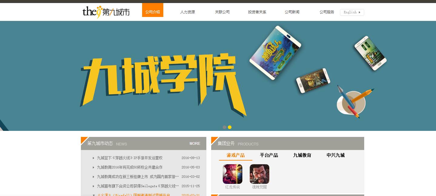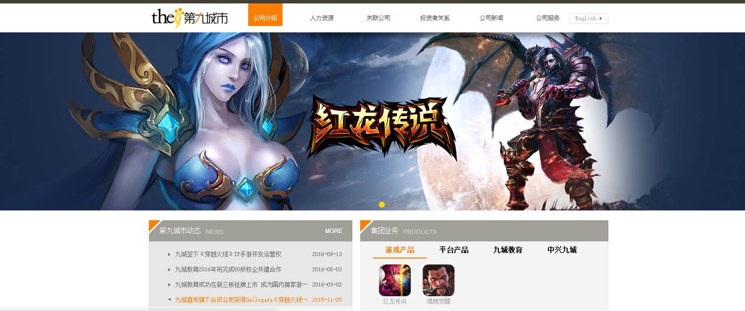 第九城市(以下简称“九城”)是位于中国的互联网互动娱乐公司,致力于通过“第九艺术”——游戏艺术,为都市人创造一种全新的在线娱乐生活方式。九城成立于1999年并于2004年在纳斯达克上市(股票代码NCTY)。九城直接或透过其关联公司开发及运营了各类客户端网游、网页游戏及手机游戏,包括《火瀑》(Firefall)、《红龙传说》(Legand of Red Dragon)等;九城旗下的合资公司还取得了全球知名射击游戏《穿越火线2》(CrossFire 2)在中国地区的代理运营权。同时,九城并发展移动互联网相关业务,包括游戏、广告、阅读等内容。